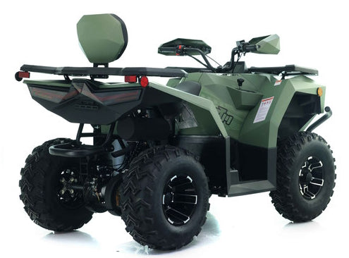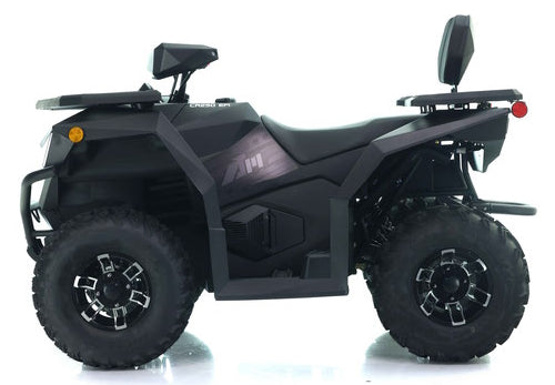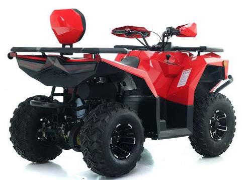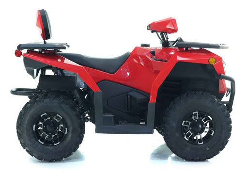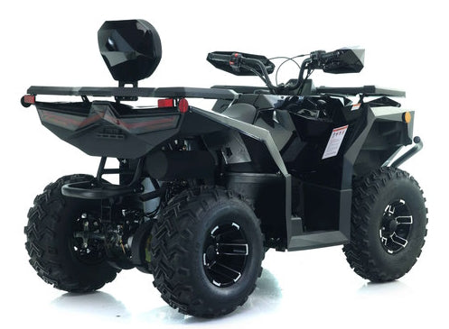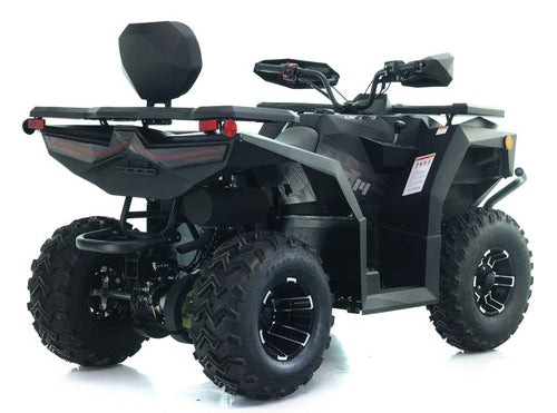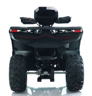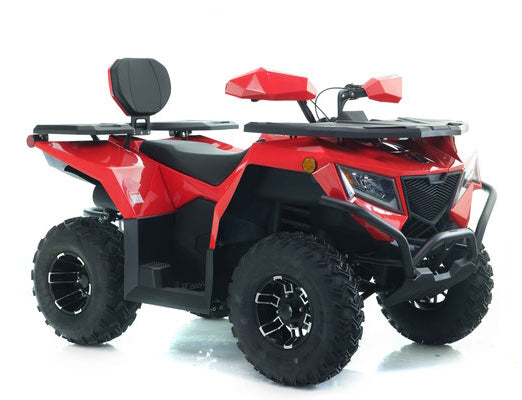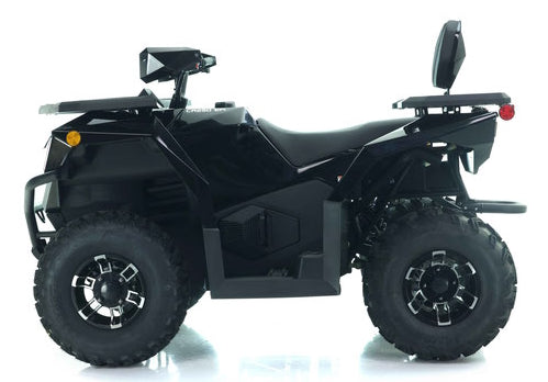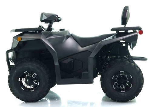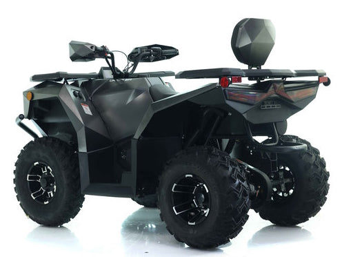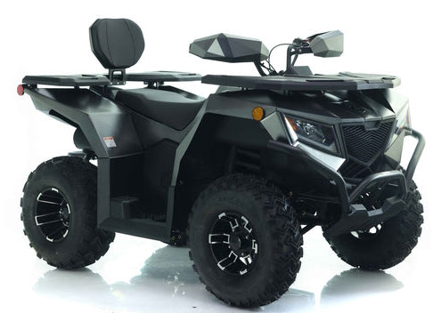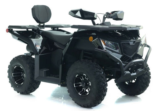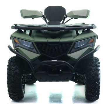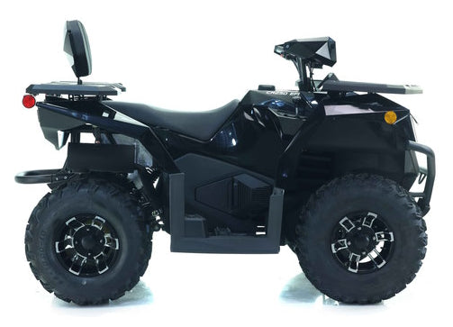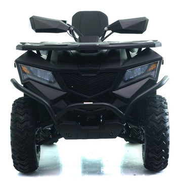 Built for both utility and comfort, this ATV includes front and rear cargo racks, a rear backrest, steel muffler, USB charging port, horn, and handlebar protectors. Its comfortable 33" seat height, 12" footrest height, and 6.69" ground clearance make it well-suited for riders of various sizes and riding environments.