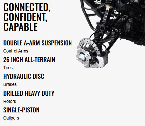 Front & Rear Hydraulic Disc Brakes w/ Drilled & Slotted Rotors & Single Piston Calipers Towing Capacity 1500 lbs