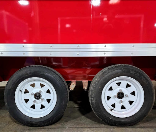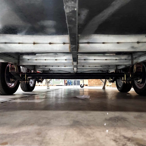 - Dual axle, four wheels, four jacks, tow hook, brake system, etc